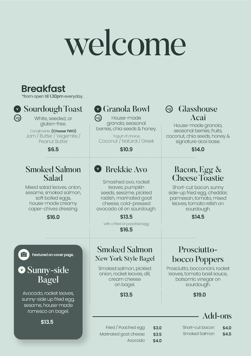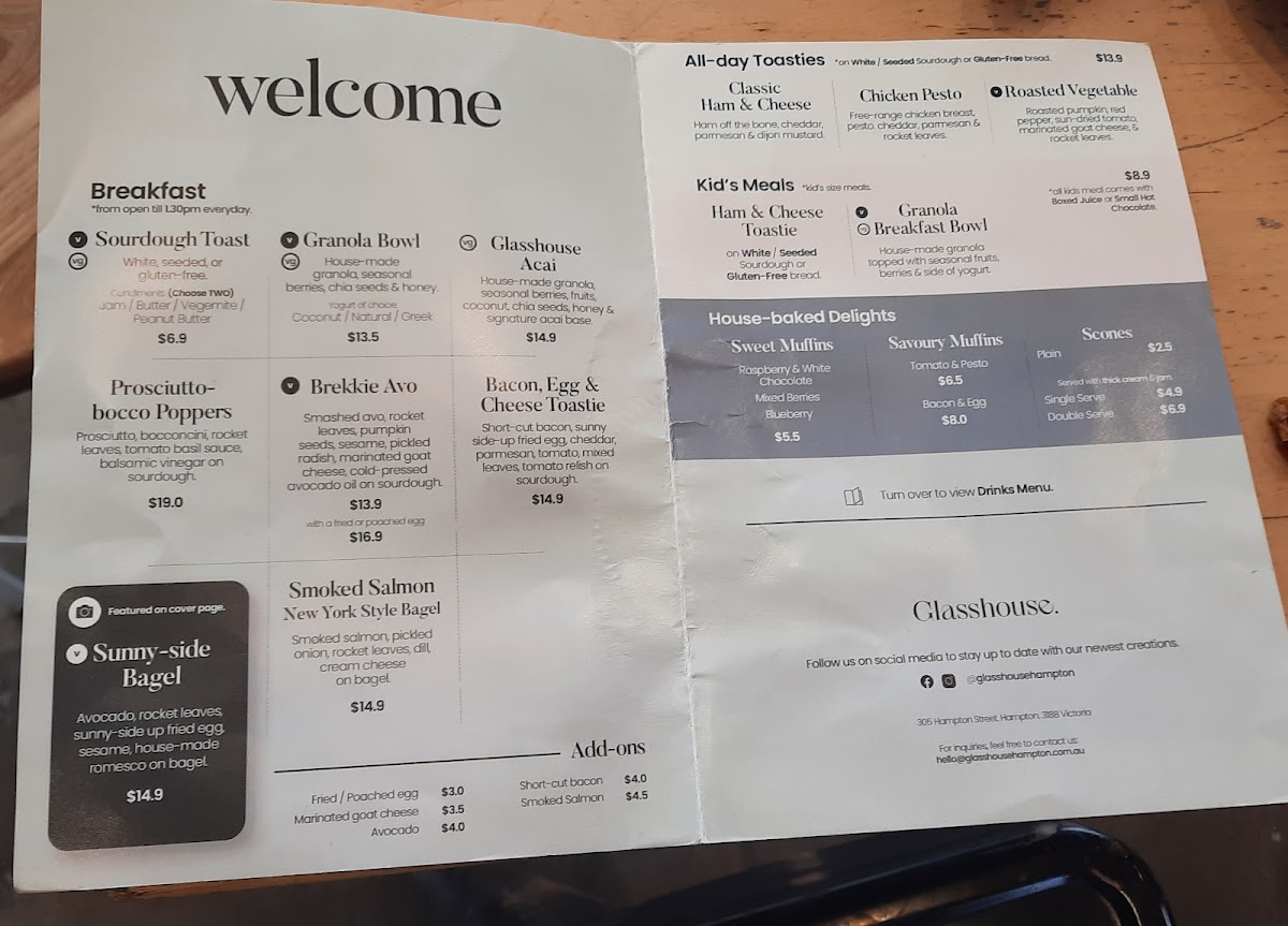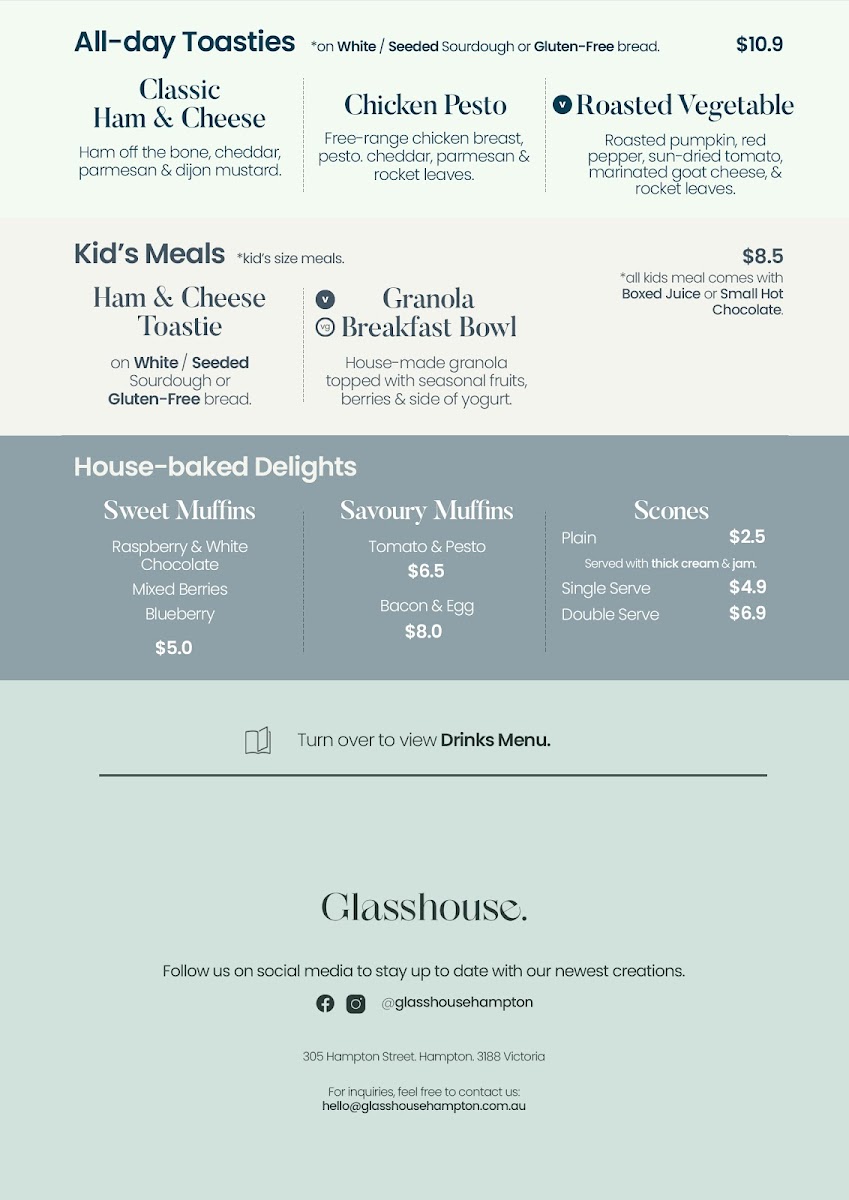 Glasshouse Hampton offers a thoughtfully curated menu that combines simple café classics with comforting and fresh options. Whether you’re stopping by for a morning coffee, a casual brunch, or a light lunch, the selection is designed to suit relaxed, everyday moments in a bright and welcoming space.